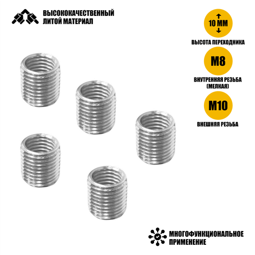 Резьбовая гайка переходник с внешней резьбой М10 и внутренней резьбой М8, высота 10 мм, 5 шт