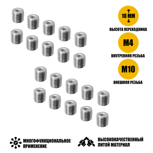 Резьбовая гайка переходник с внешней резьбой М10 и внутренней резьбой М4, высота 10 мм, 20 шт
