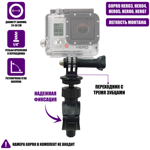 Pro на различные рули или другие перекладины имеющие диаметр от 1.5 до 3.5 см. Головка крепления поворотная - удобно менять угол и ракурс съемки без переустановки камеры. Внутренняя часть крепления обработана резиновыми прокладками для снижения вибрации и предотвращения скольжения.