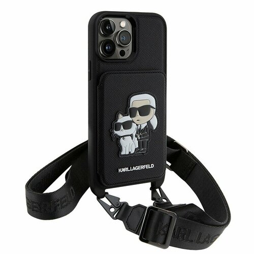 Karl Lagerfeld для iPhone 15 Pro чехол с ремешком и картхолдером Crossbody cardslot PU-кожа Saffiano Monogram NFT Choupette Hard Black