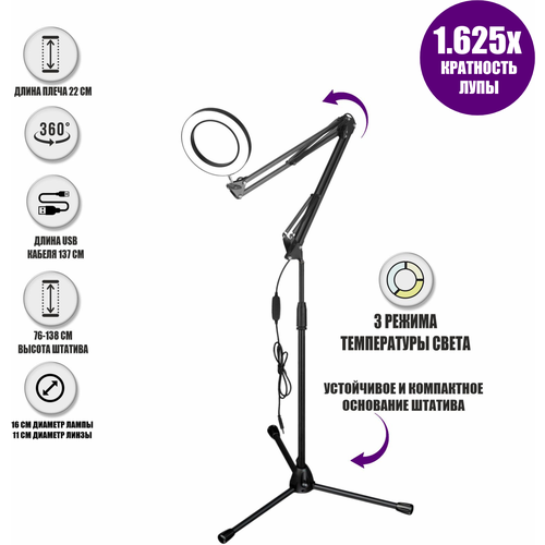 Характеристики:- Материал корпуса: ABS пластик, металл.- Материал линзы: белое стекло.- Тип подсветки: LED.- Диаметр линзы: 10.5 см.- Диаметр лампы: 16 см.- Длина верхнего плеча: 22 см.- Высота штатива: 70-134,5 см.- Источник питания - от USB.- Длина питающего кабеля: 137