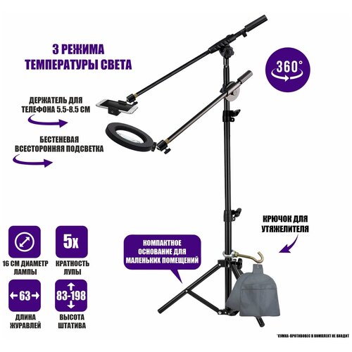 Лампа лупа напольная LN-22 с держателем телефона до 85 мм на зажиме на штативе ML, черная черный