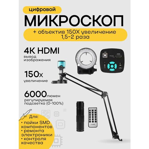 Микроскоп для пайки с дополнительным объективом 0,5х, микроскоп цифровой 150Х 4K HDMI с подсветкой