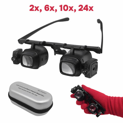 Лупа налобная очки с подсветкой, сменными линзами и чехлом (2 LED) прмт-103340