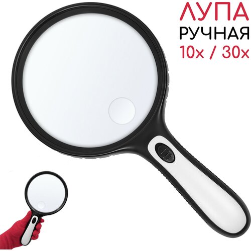 Лупа увеличительная ручная с 10 кратным увеличением большого диаметра для чтения и рукоделия 10х/30х с подсветкой 110мм (ПРМТЮ-103218)