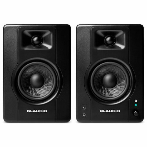 черныйM-Audio BX4 BT - пара мультимедийных двухполосных контрольных мониторов c Bluetooth. Они могут использоваться для контроля звука на прямых трансляциях, для музыкального производства, для подкастинга и работы с постпродакшном, их можно использовать в студиях звукозаписи, прожект-студиях и дома, а также в образовательных учреждениях. Один из мониторов является активным, имеющим встроенный усилитель, а другой пассивным. Общая выходная мощность составляет 120 Вт в пике. Каждый громкоговоритель оснащен низкочастотным драйвером диаметром 4,5 дюймов, а также шелковым 1-дюймовым твитером. Мониторы обеспечивают профессиональное звучание, имеют компактный корпус и привлекательный внешний вид. Благодаря встроенному Bluetooth-приемнику можно транслировать звук с любого устройства, имеющего поддержку передачи аудиосигнала по Bluetooth, будь то смартфон, плеер, компьютер или планшет. Радиус приема Bluetooth-сигнала составляет 30,5 метров. Двухполосная конструкция громкоговорителей отличается акустически инертным корпусом с