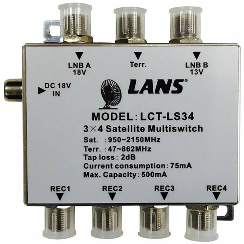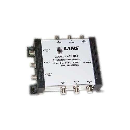 Надёжный и качественный мультисвитч Lans LS-36 подходит для деления сигнала "Триколор ТВ" и нтв-плюс на 6 ресиверов. Имеет 3 входа: два спутниковых и один эфирный. Для правильного подключения необходимо использовать Twin конвертер (с двумя выходами) На выходе получаем сложенный спутниковый и эфирный сигналы. Для разделения их на диапазоны используется SAT/TV розетки или диплексор типа С01-01.