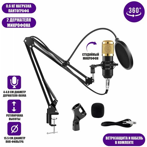 Конденсаторный микрофон BM-800, пантограф, поп-фильтр, ветрозащита, держатель микрофона, держатель паук, черно-золотой