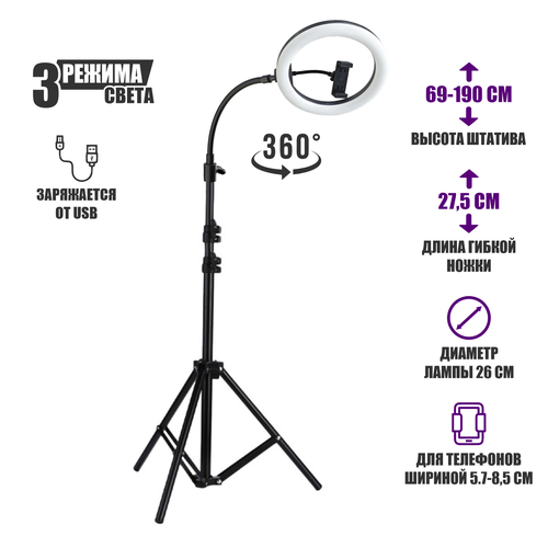 Кольцевая лампа 26 см с держателем для телефона на напольном штативе JBH-UG-L26DT с гибким креплением