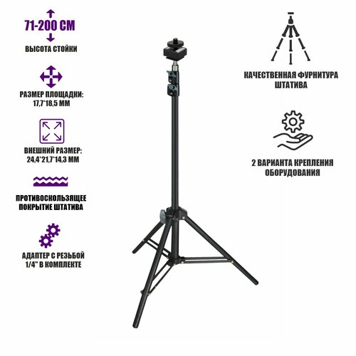 Особенности:- Телескопическая конструкция стойки;- Надежная и устойчивая опора;- Регулировка высоты штатива;- Многофункциональное использование;- Высококачественный литой материал переходника;- Материал каркаса: алюминиевый сплав;- Пластиковые заглушки на ножках для устойчивости стойки.