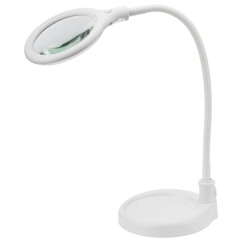 белыйКруглая настольная лупа белого цвета на струбцине с крышкой и с 5 диоптриями (увеличение 2.25 раза) с бестеневой светодиодной подсветкой (56 LED) REXANT предназначена для визуального увеличения различных мелких предметов или их фрагментов. Она используется в косметологии, в тату-салонах, при выполнении ювелирных и радиомонтажных работ, в биологии и медицине, в швейном и вышивальном деле, для организации труда людей со слабым зрением, а также для других работ, где требуется увеличение и подсветка рабочего поля. Преимущества: четкое изображение без искажения; всесторонняя подсветка; пантографический механизм, состоящий из звеньев, и хорошая устойчивость; рабочий радиус регулировки механизма 100 см; фиксация к любой поверхности; встроенный электронный блок управления; откидная крышка линзы защитит от повреждения и пыли; встроенные светодиоды - гарантия долговечности. Технические особенности: размер линзы: 127 мм; потребляемая мощность: 8 Вт.