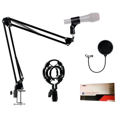 Микрофонная стойка пантограф NBS-3518 с усиленной струбциной, металлическим держателем паук и поп-фильтром диаметром 15.5 см