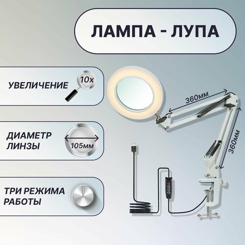 Лампа настольная с лупой 10X, на гибком кронштейне 36x36 см, на струбцине, линза 105 мм, подсветка - регулировка яркости