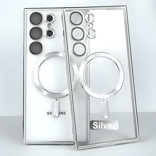 Премиальный чехол для Samsung S25 Ultra противоударный с поддержкой беспроводной зарядки с защитой камер серебристый