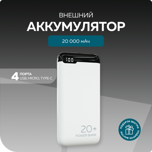 белыйАртикул № 1003587 Вместе с внешним аккумулятором More Choice PB60S-20 у вас всегда будет под рукой надежное зарядное устройство для ваших гаджетов. Внешний аккумулятор имеет несколько систем интеллектуальной защиты: от перегрева, перезаряда и скачков напряжения, а его объема в 20000 mAh хватит для нескольких циклов зарядки смартфона или планшета. Аккумулятор изготовлен из высококачественных материалов, которые способны выдержать падение, перепады температуры и другие внешние воздействия, сохранив целостность батареи, а также оснащен удобной светодиодной индикацией заряда, которая оперативно показывает заряд аккумулятора, позволяя вам всегда оставаться в курсе и не переживать, что вам нечем будет подзарядить ваши устройства. Встроенный фонарик окажется незаменимым помощником в темное время суток, а крепкий кожаный ремешок пригодится для удобной транспортировки.