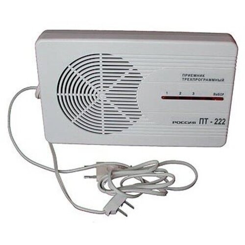белыйПеред покупкой убедитесь В наличии И В исправности точки проводного вещания! Вилка радио С плоскими штырьками!данный товар НЕ предназначен для людей С ограниченными возможностями!данный товар НЕ предназначен для людей С ограниченными умственными И психическими отклонениями !данный товар требует умственных навыков И аккуратного И точного использования согласно инструкци! НЕ предназначен для людей С инвалидностью И старше 65 ЛЕТ!Приемник трехпрограммный "Россия ПТ-222; - предназначен для воспроизведения передач, транслируемых по системе трехпрограммного проводного вещания. Приемник позволяет воспроизводить любую из трех программ: 2 программы, передаваемые по радиочастотным каналам и 1, передаваемую по каналу звуковой частоты. На каждую программу установлен светодиодный индикатор включения. Принимаются программы на следующих каналах: 1-я программа - основной канал звуковой частоты 2-я программа - канал радиочастоты с несущей частотой 78 кГц 3-я программа - канал радиочастоты с несущей частотой 120 кГц. Техническ