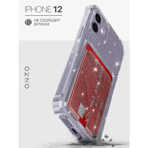 Чехол на iPhone 12 с усиленными углами и с карманом для карт / Бампер на Айфон 12 прозрачный с серебряными блестками
