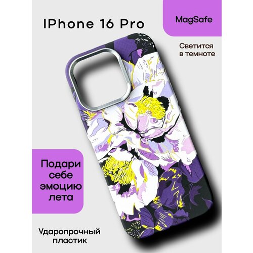 Чехол на IPhone 16 Pro с MAGSAFE женский из ударопрочного пластика с цветами и защитой камеры фиолетовый