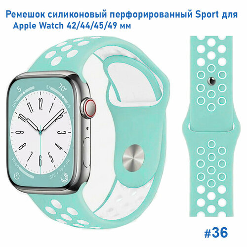 Ремешок силиконовый перфорированный Sport NK для Apple Watch 42/44/45/49 мм, на кнопке, бледно-бирюзовый+белый (36)