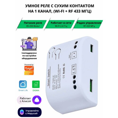 Умное реле с сухим контактом на 1 канал 220 В, (Wi-Fi Tuya + RF 433 МГц)