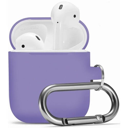 Силиконовый чехол на беспроводные наушники Apple AirPods 1 и 2 с карабином / Противоударный чехол для кейса на Эпл Аирподс 1 и 2 / Фиолетовый