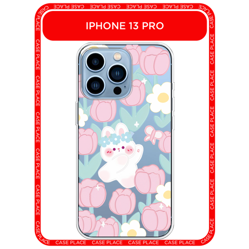 Чехол на Apple iPhone 13 Pro / Айфон 13 Про с принтом Зайка в тюльпанах, прозрачный