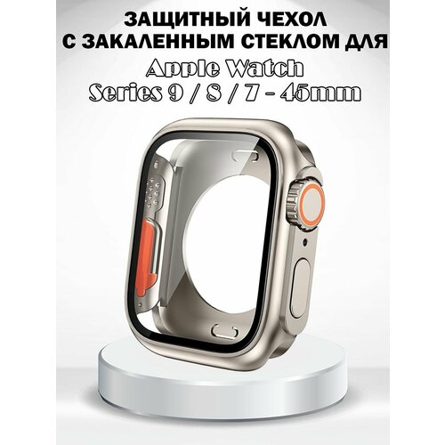 Защитный жесткий чехол с закаленным стеклом для Apple Watch Series 9 / 8 / 7 45мм - титановое золото