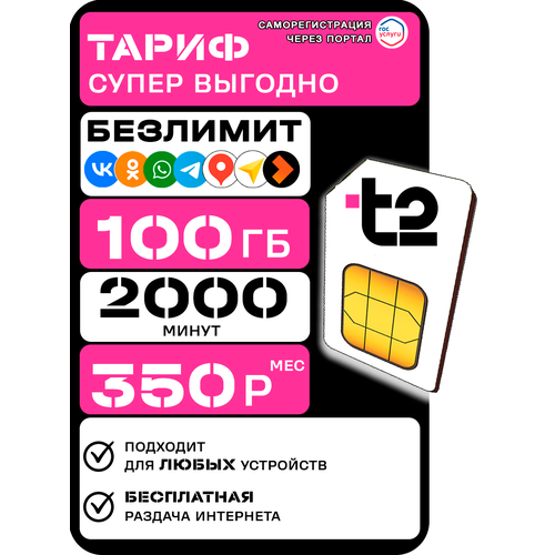 Sim теле2 c Саморегистрация . Специально для интернета безлимит на социальные сети. 100 ГБ на другой трафик.