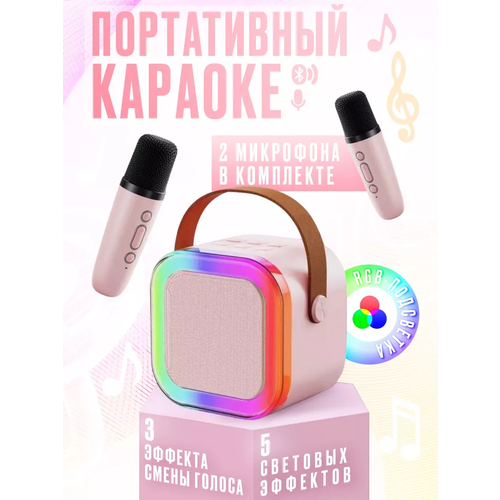 Портативная блютуз мини колонка караоке с 2-мя микрофонами розовая, BLUETOOTH, музыкальная переносная колонка, караоке система для дома и в путешествиях