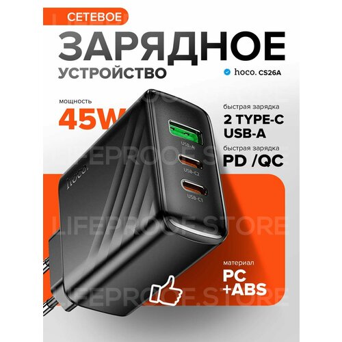 Сетевое зарядное устройство Hoco CS26A, USB-A, 2 Type-C PD45W быстрая зарядка, цвет Черный