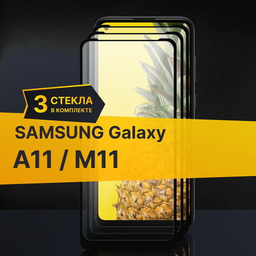 Комплект 3 шт. Противоударное защитное стекло для телефона Samsung Galaxy A11 и M11 / Полноклеевое 3D стекло с олеофобным покрытием на смартфон Самсунг Галакси А11 и М11 / С черной рамкой