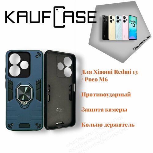Противоударный чехол на Xiaomi Redmi 13 4G/Poco M6 4G (6.79"), темно-синий. Кольцо-держатель и магнитное крепление, яркие пластиковые защитные вставки