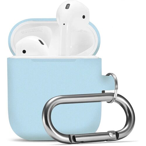 Силиконовый чехол на беспроводные наушники Apple AirPods 1 и 2 с карабином / Противоударный чехол для кейса на Эпл Аирподс 1 и 2 / Небесно-голубой