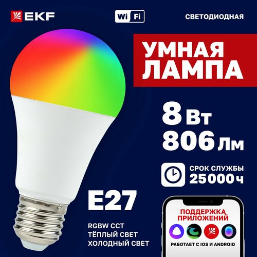 Умная светодиодная лампочка EKF Connect 8W RGB+W E27 с Wi-Fi, Яндекс Алисой, Марусей, Салютом