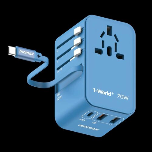 Универсальное сетевое зарядное устройство Momax 1-World+ 70W GaN Tech 3-Port+AC Travel Adapter with Retractable UCB-C Cable 65cm - Blue