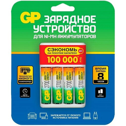 Зарядное устройство GP для аккумуляторных батареек АА и ААА на 4 слота, с аккумуляторами AA 2700 mAh NiMH, набор 4 шт