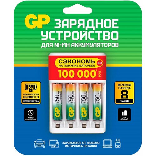 Зарядное устройство GP для аккумуляторных батареек АА и ААА на 4 слота, с аккумуляторами AA 2700 mAh NiMH, набор 4 шт