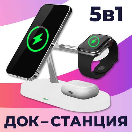 Беспроводная Док станция 5 в 1 MagSafe для iPhone, Apple Watch, AirPods / Магнитная зарядка 15W на телефон Айфон, Андроид, АирПодс, Эпл Вотч / Белая