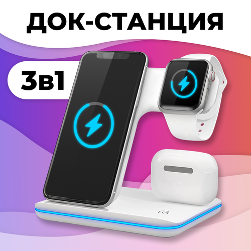 Беспроводная Док станция 3 в 1 на телефон iPhone и Android, часы Apple Watch, наушники AirPods / Зарядка для Айфон, Андроид, АирПодс, Эпл Вотч / Белая
