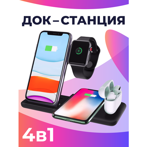 Беспроводная Док станция 4 в 1 на телефон iPhone, Android, часы Apple Watch, наушники AirPods / Зарядка для Айфон, Андроид, АирПодс, Эпл Вотч / Черная