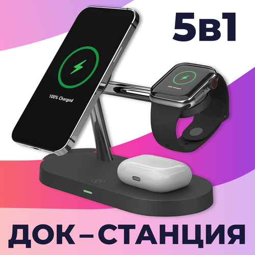 Беспроводная Док станция 5 в 1 MagSafe для iPhone, Apple Watch, AirPods / Магнитная зарядка 15W на телефон Айфон, Андроид, АирПодс, Эпл Вотч / Черная