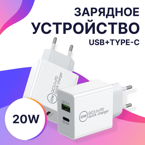 Зарядка для двух устройств 20W / Блок с быстрой зарядкой / USB Type-C 20 Ватт / Белый