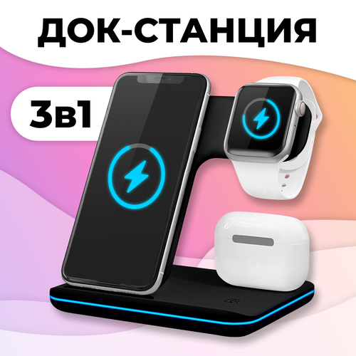 Беспроводное зарядное устройство 3 в 1 для телефонов iPhone и Samsung / для часов Apple Watch и наушников AirPods и AirPods Pro / Быстрая зарядка 15W / Док-станция, Черная