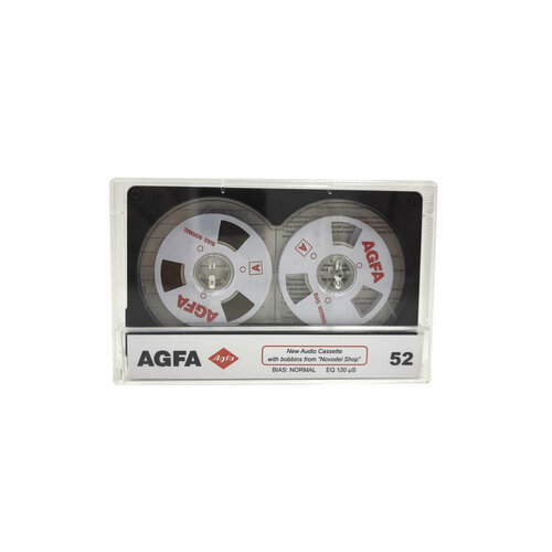 Аудиокассета "AGFA" с белыми боббинками в чёрно-прозрачном корпусе