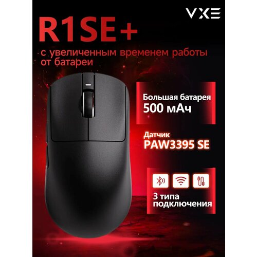 Беспроводная мышь VXE R1 SE+, оптический сенсор PAW3395, Длинная продолжительность , Чёрный