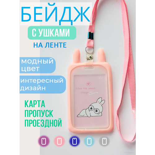Бейдж с ушками Зайчик, Кролик в силиконовой оправе, для пропуска, чехол для карты, на ленте, для аниме-карточки, для школьной карты. Розовый.