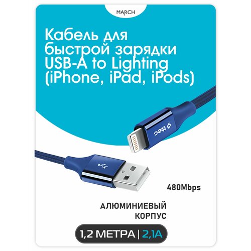 Кабель TTEC Alumi USB-A - Lightning, длина 1.2 м. / Быстрая зарядка, Синий, Оплетка (2DK16L)