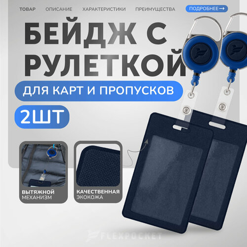 Комплект держателей для пропуска, бейджа, чехлы для карт доступа с рулеткой Flexpocket, цвет темно-синий 2шт