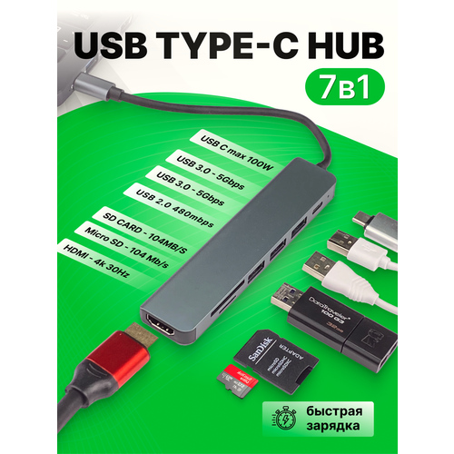 Переходник - разветвитель USB HUB 7 в 1 Type-C, SD Card, Micro SD, TF Card серебристый