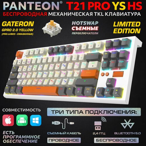 PANTEON T21 PRO YS HS White-Ivory-Grey (61) Limited Edition Механическая игровая программируемая клавиатура (TKL 80%, подсветка LED RGB, свитчи GATERON GPRO 2.0 Yellow, 87 кл, HotSwap, USB/Bluetooth/2,4 Ггц, аккумулятор 2000 mAh, ПО)